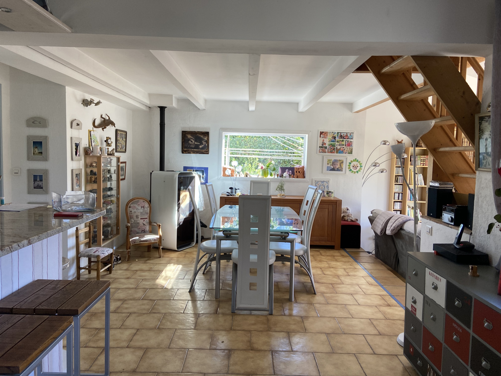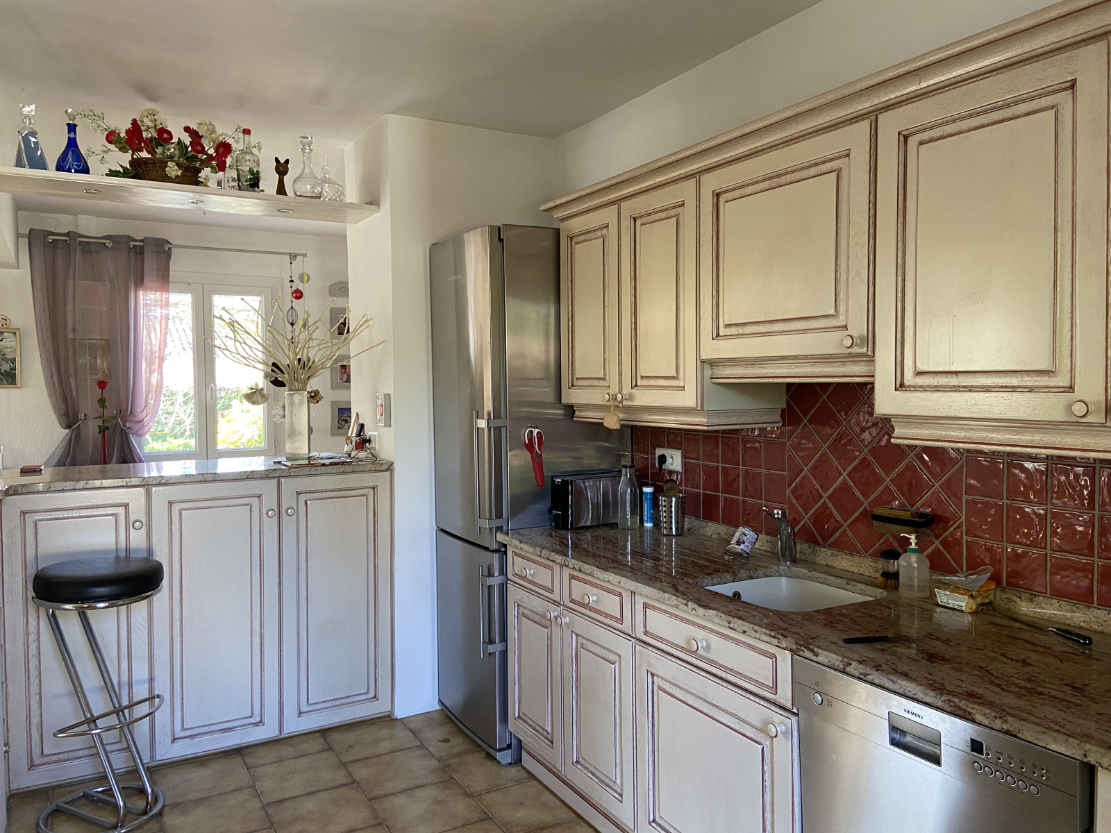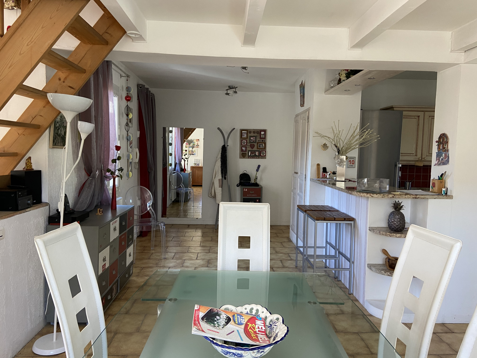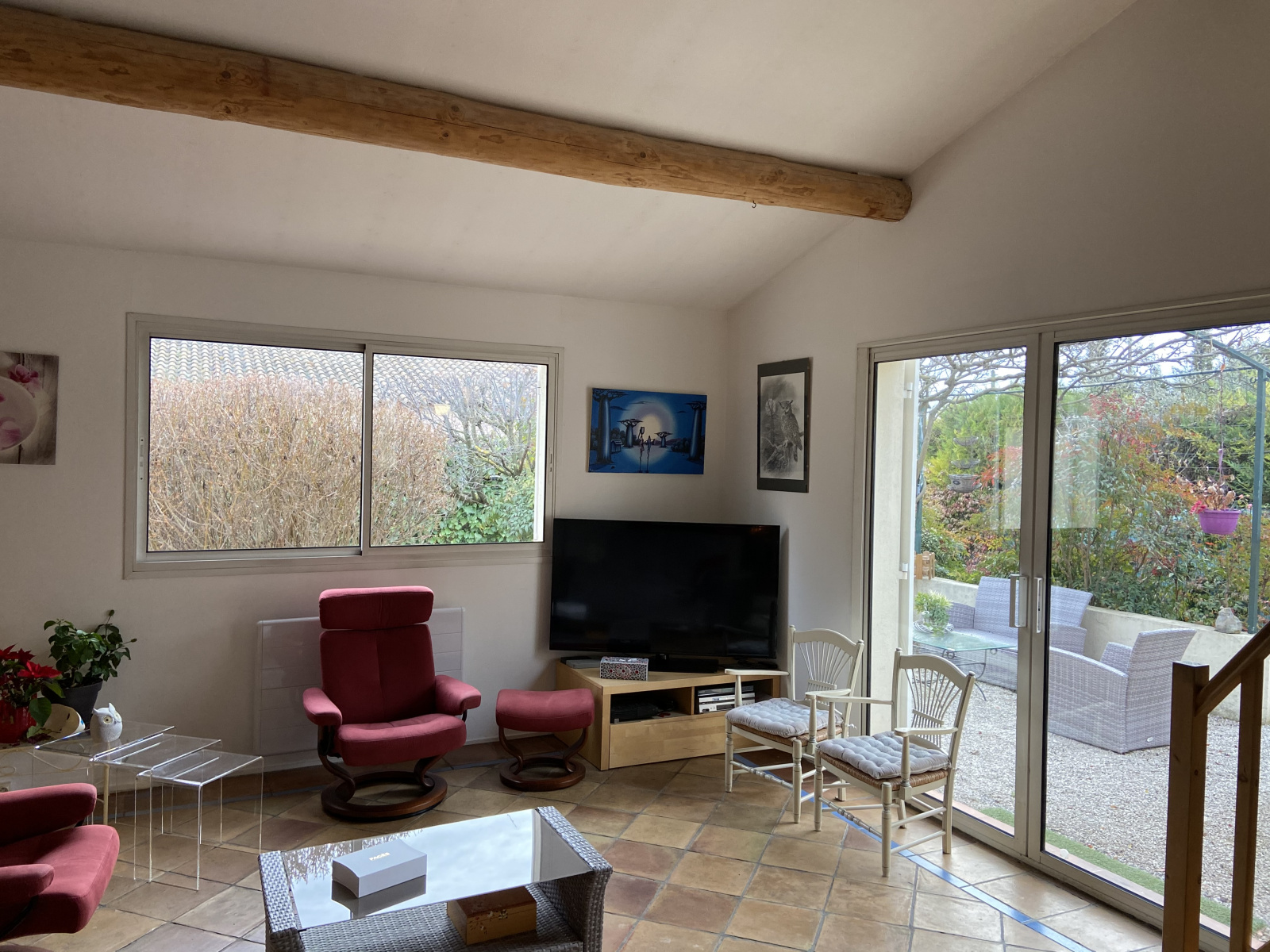 Eguilles à km d'Aix en Pce - Sous compromis - Cette maison de plain pied des années 80 est mitoyenne à l'est sans aucun vis à vis et avec un mur pour chaque maison ; Elle se compose d'un hall d'entrée, d'une pièce de vie (50m2)/cuisine équipée (9m2), d'une cellier, de 3 chambres ((9-12,5m2) , d'une salle d'eau, d'un wc indépendant et d'une mezzanine à utiliser selon besoin chambre, bureau... ; Sur la parcelle de 600 m² reposent en plus de la maison, une piscine coque (3,5x6,5m), une cuisine d'été et un atelier; Le chauffage est produit par un poêle à granules et des chauffages électriques ; La taxe foncière est de 900 euros ; L'eau est de la ville ; L'orientation est nord/sud ; Le bien est en bon état d'entretien ; La dépense annuelle d'électricité est de 1100 euros ; DPE : D ; La proximité immédiate d'avec les bus, écoles...est un réel atout ; Le prix de vente total s'élève à 535 000 euros. Maison joyeuse et confortable